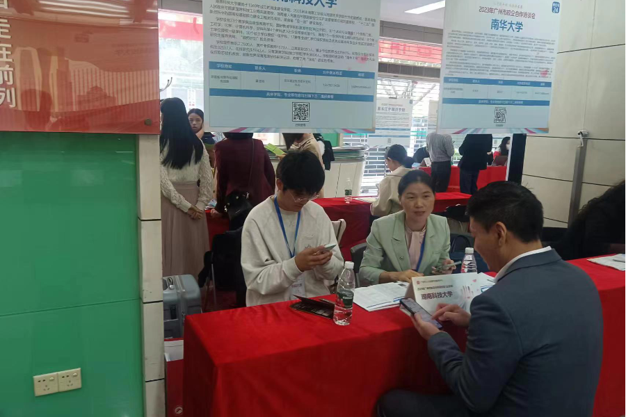 叶军一行先后于21日和22日参加了由广州市人力资源和社会保障局及广州市黄浦区人力资源和社会保障局分别在广州市人力资源市场服务中心和广州市黄浦区体育馆举办的政校企合作洽谈会。会上,叶军一行向参会企业代表热情介绍我校人才培养工作及毕业生整体情况,并诚挚邀请单位来我校招聘。