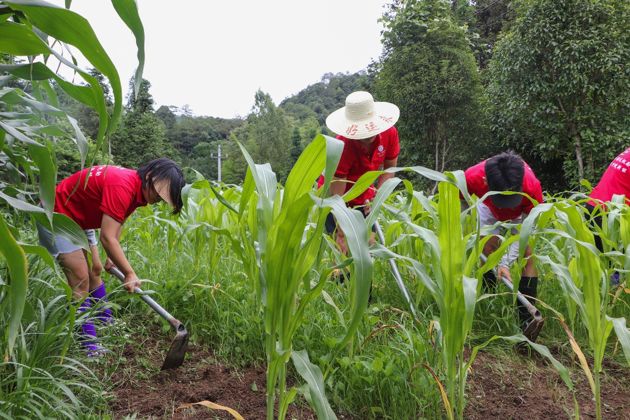 潇湘青年学子头顶烈阳、手持锄头,向尚未成长为高秆玉米的田地内肆意丛生的杂草进行铲叶刨根。铲草动作通过一遍遍的劳动实践,逐渐从生疏变为熟练,铲除的杂草也越堆越高。随后,有丰富经验的当地阿姨指导师生们将铲除的杂草和碎土一起堆肥于苗秆下,以减少水分蒸发、营养物质流失。