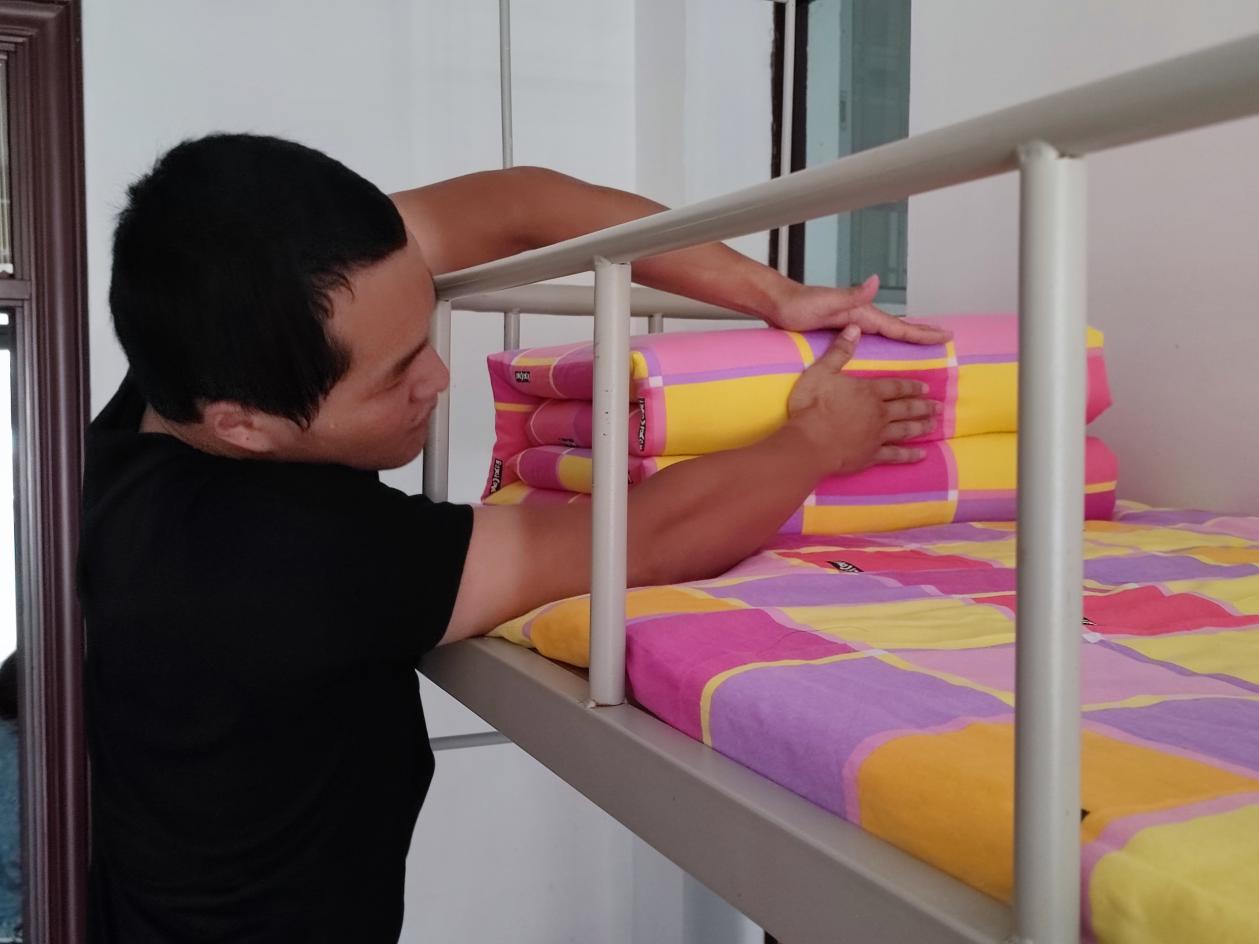 “出门看队伍,进门看内务”,内务整理作为军训必修课之一。退役军人们仔细向新生们介绍内务标准并亲自示范,短短几分钟退役军人们将书籍归类做到整整齐齐、鞋子衣物做到各有归处、被子一捋做到四四方方,把杂乱狭小的宿舍整理得整齐宽敞。beat365唯一官网退伍军人杨鹏志说道:“走出军营,重返校园,脱下军装,我时刻以军人的标准严格要求自己。希望新生们能学习军人的意志品格,脚踏实地,时刻严格要求自我。”