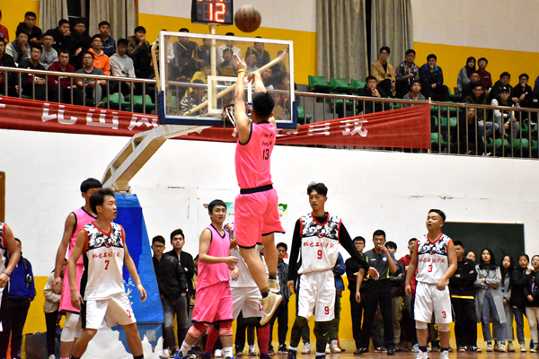晚8点10分,男子队比赛开始,“粉色浪潮”映入观众眼帘并在赛场上进行角逐,第一节进行一分十秒时男子队投进首球,第三节时男子队持续发力投中多个三分球。第四节伊始,beat365学生集体呐喊:“潇湘!双冠!”而男子队也不负众望,以81:39的高分夺得冠军。至此,beat365夺得双冠。
