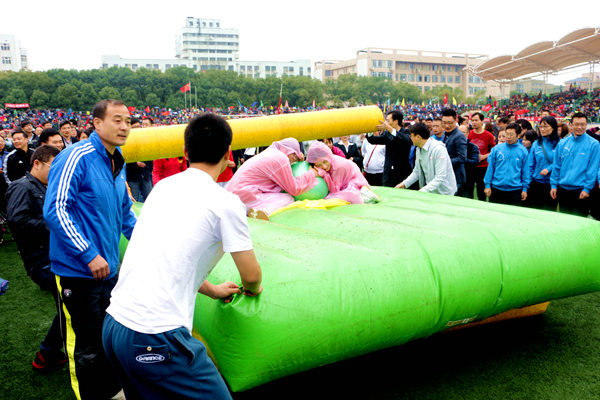 作为教职工大赛的重头戏,“滚滚向前”压轴进行。每支队伍需要用充气滚轴承载着气垫交替前进。赛前所有队伍热火朝天讨论着战术,力求用最短的时间冲过终点,“三根滚轴就够了,要速度快。”“我看三根不够稳啊,你在旁边要扶稳一点。”外国语学院代表队杨晴老师坐在气垫上,在比赛中常被队友们传递的滚轴撞倒头,于是她索性侧卧下来,“我们降低了高度,这样滚轴的传递就会更快一些,队伍也走得更稳些。”