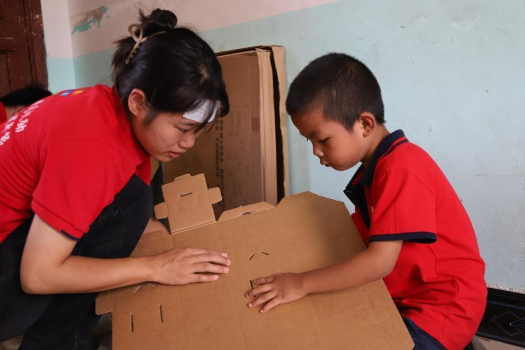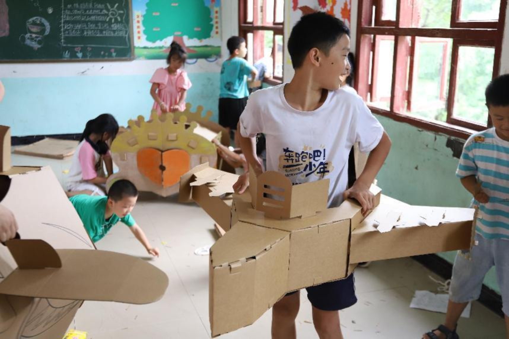 美术手工不仅丰富了小朋友们的假期,更能培养动手动脑的能力,启发学生创造性思维以及想象力与创造力。志愿者们带领学生们制作大型纸质模型,其种类丰富,以国之重器“火箭军装甲车”、“歼20战斗机”等为主,还有其它类型的军事武器模型,如“钢铁战车”、“双炮坦克”等,又有一小部分像“糖果汽车”、“鲨鱼飞机”等可爱而充满童趣的交通工具模型。在志愿者的陪同下,孩子们互相合作,自己动手拼装模型、并为模型上色。在志愿者们的指导下,一件件精美的大型纸质模型踊跃而出,学生们看见自己搭建的模型,深刻感受到建筑的乐趣,在心中种下了一颗颗设计梦想的种子。