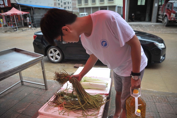 凌晨5点30分,其他队员都在酣睡,后勤组的成员已经默默起床为大家准备早饭,凉粉、馒头、炒饭每天的早饭虽然简单,但从不重复,他们尽自己的最大努力让队员们吃的开心;每天上午,后勤组队员们攥着有限的经费,在菜市场和菜贩们“唇枪舌战”,用最少的钱,买到最多的原料,每天中午的四菜一汤虽然简约,但并不简单,俗话说:“饭不抢不香”,每天中午,队员们都吃的“狼吞虎咽”、“风卷残云”。除去每天的正餐,后勤组还贴心的为大家准备了凉茶、冰西瓜等解暑“神器”,可以说是为服务队的饮食操碎了心。
