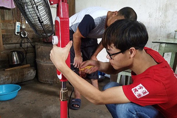 “我们家灯坏了很久,不知道能不能修?”一位老爷爷问道,志愿者赶紧迎上去,扶老爷爷坐下随后对坏掉的灯进行了检查与维修,老爷爷看着起的灯泡,对他们表示了的感谢。即使早已汗流浃背,也冲刷不了志愿者们的热情,他们的敬业赢得了村民们的赞扬。